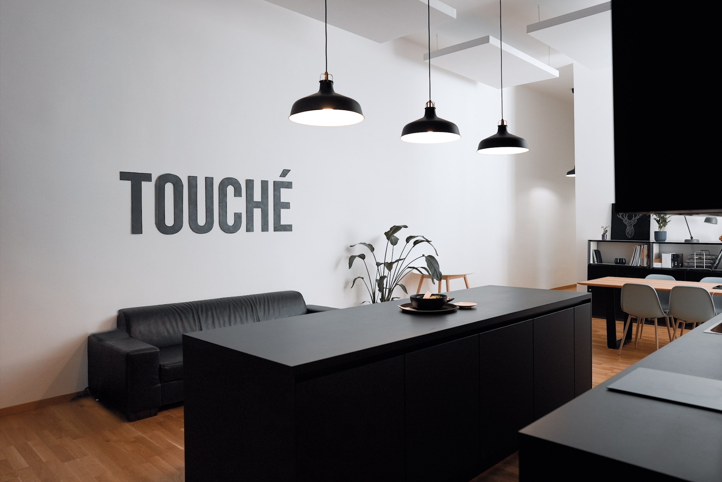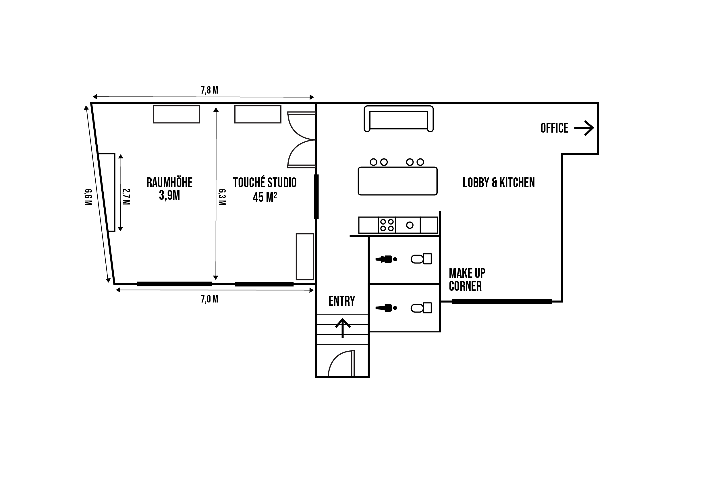 Mit ausgestatteter Küche, einem gemütlichen Sofa und einem großen Besprechungstisch lädt unser stilvoller Loungebereich zum Verweilen ein und bietet Platz für Make-Up und zum Umkleiden.